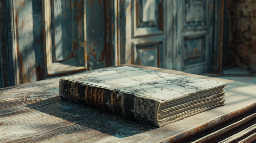 A cinematic image of an elegant book with pages made of thin marble layers, placed on an antique wooden table, ambient lighting casting gentle shadows to emphasize the book's luxurious texture and the marble's intricate patterns, the scene set in a scholarly study with vintage elements, capturing a moment of serene contemplation, widescreen format to convey the depth and atmosphere of the setting, 4K resolution --ar 16:9 --style raw