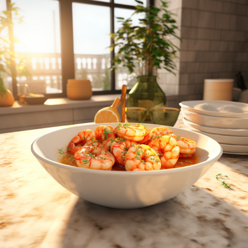 bowl of hot grits and shrimp, marble counters, bursting with flavor, modern kitchen background, realistic, 8k,