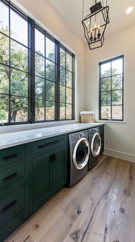 bright large 12 foot by 12 foot laundry room, 10 foot high ceilings one black framed picture window, white quartz countertops, European organic style, with dark green upper and lower cabinetry surrounding and light stone walls --s 50 --v 6.0 --style raw --ar 9:16