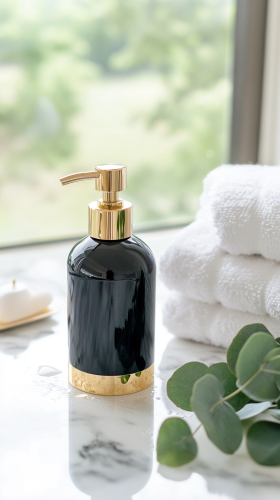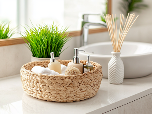 The image shows a bright and clean bathroom countertop. On the countertop: Centerpiece: A woven basket filled with various toiletries. These include soap dispensers, a tube of lotion or cream, a bar of soap, and other items that are not clearly visible. Next to the basket: A small potted plant with green grass. Further to the right: A set of reed diffusers in a white ceramic vase. Background: A white sink, a faucet, and a mirror with a wooden frame are visible in the background. The overall impression is one of a tidy and well-maintained bathroom space with a focus on natural materials and a minimalist aesthetic. --ar 4:3