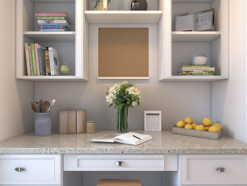 Here is a description of the image: Overall Impression The image showcases a well-organized and charming kitchen desk nook, perfect for meal planning, keeping track of schedules, and even light work. It's a beautiful blend of functionality and aesthetics, making it a practical and inviting space within the kitchen. Key Details Desk Area: A compact desk with a granite countertop provides a dedicated workspace. It features drawers for storage and is adorned with a vase of flowers, a notebook, and a pen, creating a serene ambiance. A small stool tucks neatly underneath. Shelving and Storage: The desk is nestled amidst a wall of white cabinetry and open shelving. The shelves are thoughtfully arranged with cookbooks, decorative items, and storage baskets, showcasing both functionality and style. Organization Hub: Above the desk, a corkboard serves as a central command center for notes, reminders, and inspiration. Two calendars help keep track of schedules and important dates. Kitchen Context: Elements like the countertop, the presence of fruits, and glimpses of cabinetry suggest this nook is integrated into a kitchen space. Color Palette & Style: The overall color scheme is predominantly white and neutral, creating a clean and airy feel. Pops of color from the book spines, decorative items, and the corkboard add visual interest. The style leans towards traditional or classic with hints of modern farmhouse charm. --ar 4:3