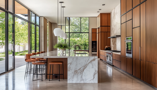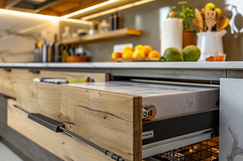 Close-up of an optimized kitchen workspace with a large, clutter-free countertop, pull-out drawers, and adjustable shelves, natural textures, soft lighting, realistic and functional design --v 6.0 --style raw --ar 3:2