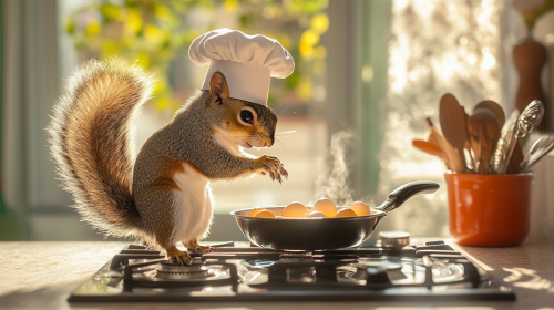Capture the playful essence of a squirrel wearing a chef's hat, standing on a kitchen countertop scambling eggs over a gas cooktop. Inspired by the whimsical world of Pixar animation. The photograph showcases the squirrel busily stirring the eggs in the pan. Against a vintage backdrop of a sunlit modern kitchen. The image is beautifully composed, with the squirrel occupying the center of the frame and the surrounding environment adding depth and context. The photograph captures the joy and spontaneity of the moment, inviting viewers into a world where imagination knows no bounds, UHD, 16k, retina --ar 16:9 --v 6.1