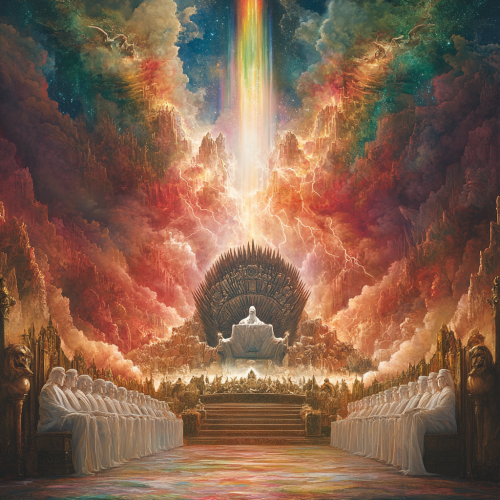 A throne in heaven, and someone sitting on it. The one sitting there looks like gray quartz and red quartz. There is a rainbow around the throne which looks like an emerald. Around that throne are 24 other thrones, and on these thrones sit 24 leaders wearing white clothes. The leaders have gold crowns on their heads. Lightning, noise, and thunder come from the throne. Seven flaming torches burn in front of the throne. In front of the throne, there is something like a sea of glass as clear as crystal. In the center near the throne and around the throne are four living creatures covered with eyes in front and in back. The first living creature is like a lion, the second is like a young bull, the third has a face like a human, and the fourth is like a flying eagle. Each of the four living creatures has six wings and are covered with eyes, inside and out.