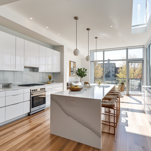 A view of the kitchen in a luxury, new construction, condo in Washington, DC, specifically Glover Park. The unit features light brown wood floors, neutral wall colors, modern staging, modern light fixtures, large windows and lots of natural light. The kitchen wall cabinets are frosty white. The kitchen Islands are ice blue. The kitchen isalnd countop is white, and textured quartz. All other kitchen countertops are also plain white and textured quartz. All plumbing fixtures and cabinet handles are brushed nickel. Vivid and realistic. Create identical to the description.