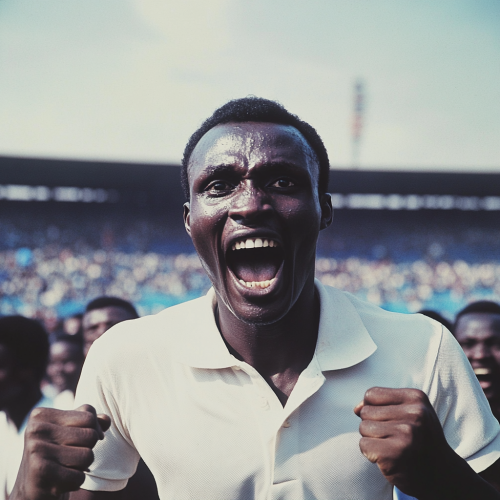 A Tanzanian man in a clean white polo shirt, looking directly at the camera with open eyes, shouting in joy about his victory. His mouth is open in a smile, fists clenched in excitement. Behind him, a stadium filled with fans, with of shimmering glitter.