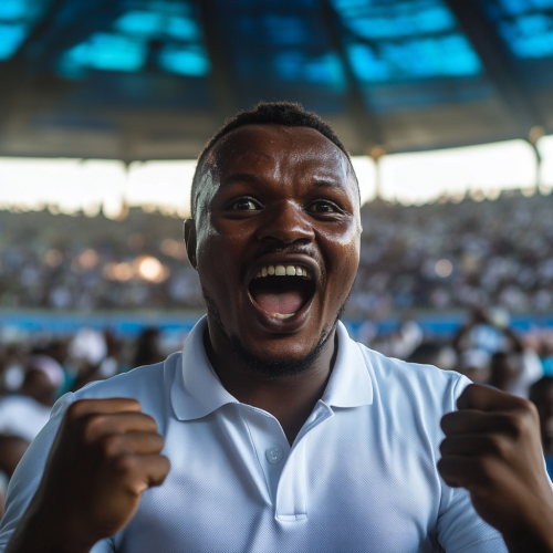 A Tanzanian man in a clean white polo shirt, looking directly at the camera with wide-open eyes, shouting in joy about his victory. His mouth is open in a smile, fists clenched in excitement, and his hands are raised in the air. Behind him, a stadium full of fans, with a banner in shades of blue and shimmering glitter