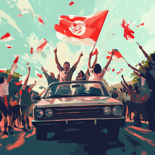 few people coming out from the car, with Georgian flags in their hands, celebrating their football team winning the championship. they look so happy. it needs to be illustrated.
