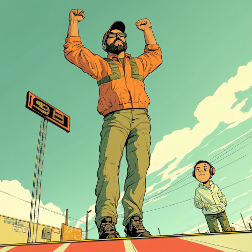 comic mechanic guy in work clothing that won a running contest, standing behind the finish line on a winners podest on place 1, reaching the hands to the top. next to him is a smaller person in white collar lab clothes and having headphones on the shoulders looking sad on the ground