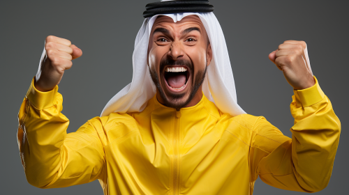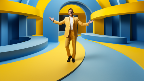 A happy Arab man wearing a yellow uniform makes a big football victory gesture , the location is: A blue pathway leading to a graphic yellow set depicting an exterior home, the set is built in a studio for a Samsung commercial, gradient yellow colour blends, hints of blue accents in the set design, layered composition, against a big light blue background, studio lighting, abstract minimalism, Hasselblad X1D, detailed photography, studio photography --ar 16:9 --s 350 --c 10 --style raw