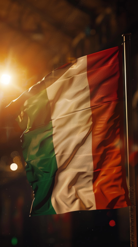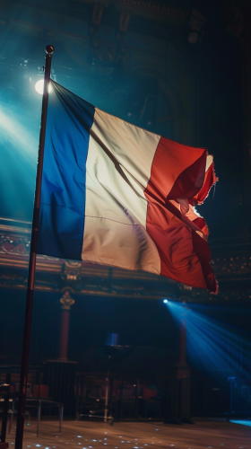 French flag is lit by the projector. The colors are still very visible. Cinematic. Very beautiful lighting. Realistic. The flag occupies the whole picture. --ar 9:16 --v 6.0 --style raw