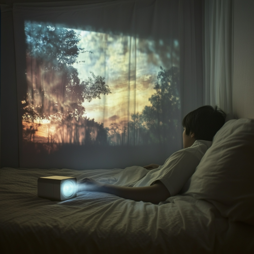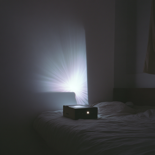 In a dark bedroom there is a bed, in front of the bed is a white wall where a movie is projected. On the bed is the projector, which is very small and looks like a small cardboard box. The projector is almost invisible