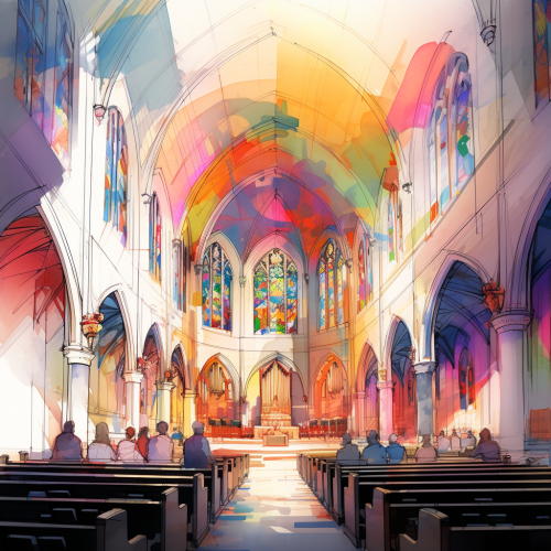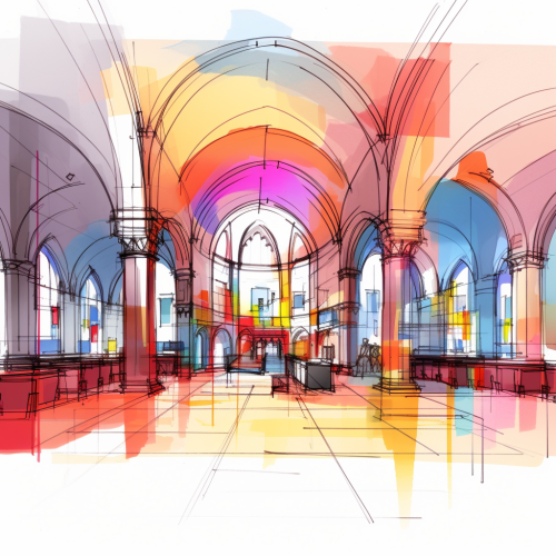 a colorful sketch of an architerctural rendering of a blank screen inside a church