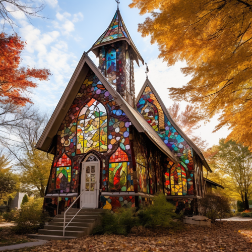 a little brown church in the wildwood a steeple lots of colorful stained glass windows, lots of colorful trees