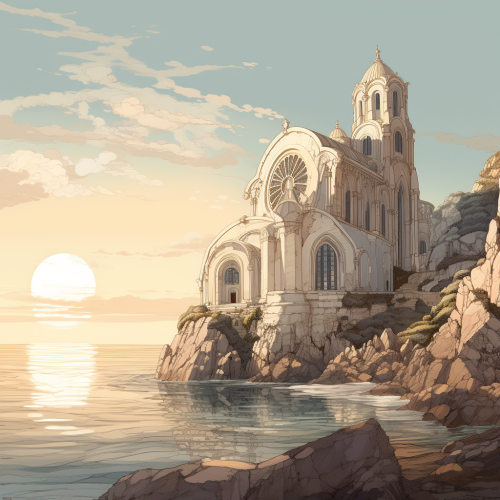 an ancient gothic church shaped like a nautilus, weathered, vintage, architectural sketch, carved white marble, subtle colors, on a promontory overlooking the sea, late afternoon sunlight, nautilus shape, vector