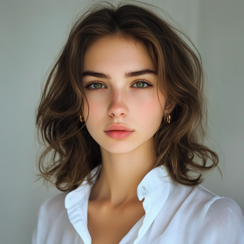 5 foot 6 in girl, shoulder length brunette hair, 20 years old, fair skin, fit, gold earrings, white shirt, jeans, green eyes, long lashes. Realistic, photo from iphone. strong jawline, shaped eyebrows, long nose, tall face