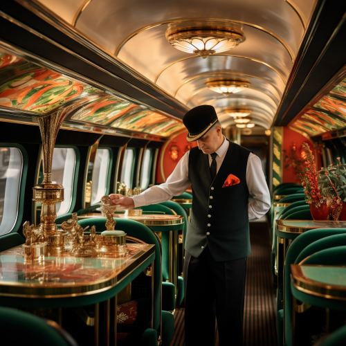 the interior of a Gatwick Express train Carriage decorated with gold green and black Art deco wall paper, a waiter offering chanpange to guests --v 5.2