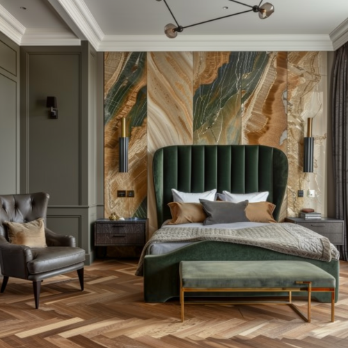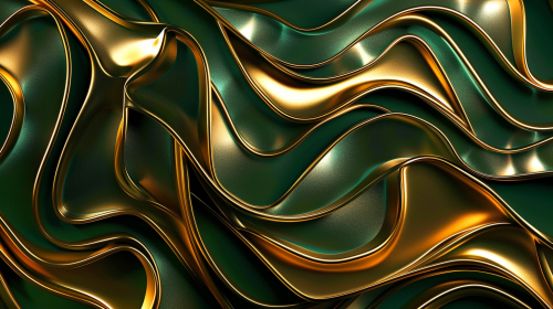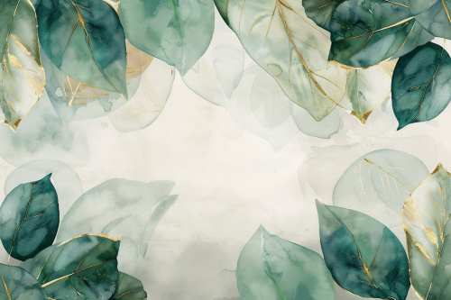A serene and artistic mural featuring large, overlapping green leaves with delicate gold accents. The leaves are softly textured with a watercolor effect, blending seamlessly into a light, neutral background. The overall design is calming and natural, perfect for creating a peaceful atmosphere in a room. The composition focuses on the contrast between the rich greens and the subtle gold lines, adding depth and elegance to the space --ar 3:2 --v 6.0