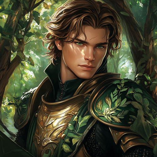 a handsome knight with brown hair parted down the middle and green eyes. He is in a forest. He wears green and gold armor with leaf and floral motifs. Graphic novel. Wayne Reynolds fantasy art.