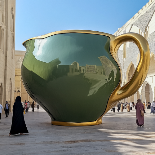 an art installation and sculpture of a very big olive green and gold and biege Arabic coffee mug in the middle of historical jeddah albalad show the people around