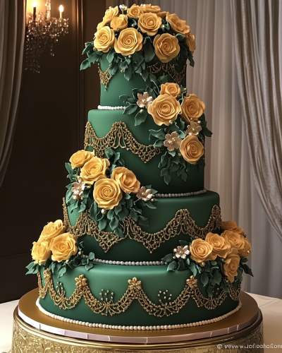 Create a tall multi tiered cake design using mint green and dark Green and shiny gold. An Arabic Persian Moroccan Turkish design inspired cake design. An arrangement of small roses in bright yellow with ivy and small flowers are on the top. The bottom of this cake has the same type of flowers. Rhinestones and gems. Thin Swags of fondant draped edges. Gold royal icing filigree designs. This cake sits on a gold cake stand on a dessert table with ruffled tablecloths. There are curtains in the background and excellent lighting and spotlights on the cake. --ar 4:5 --v 6.1 --stylize 300