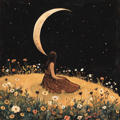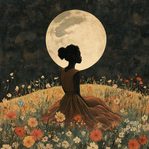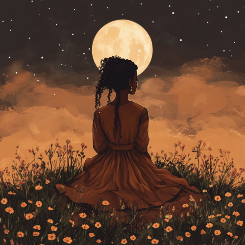 A tarot card style illustration of a black woman sitting on a hill under the NEW moon, not the full moon. The moon is dark. She is wearing a brown dress. There are flowers in the field around her.