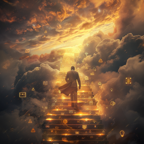 A businessman in a flowing suit climbing ethereal stairs ascending into a dramatic sky, each stair made from different glowing digital marketing elements - social media icons, email symbols, SEO graphs, website code, and search bars, photorealistic style, low angle view, golden hour lighting, volumetric clouds, depth of field, motion blur on coat, hyper-detailed, cinematic atmosphere --v 6.0