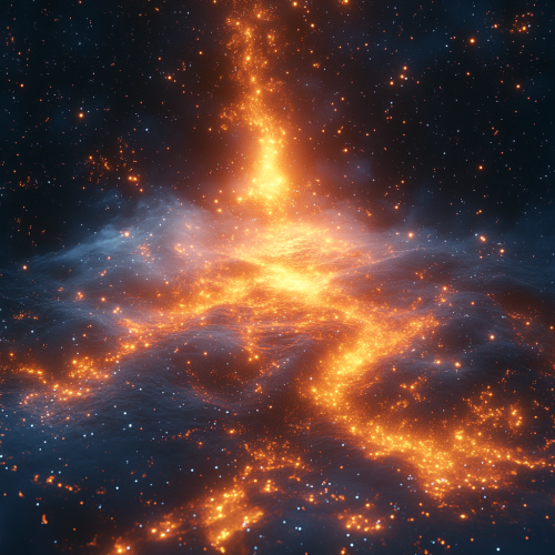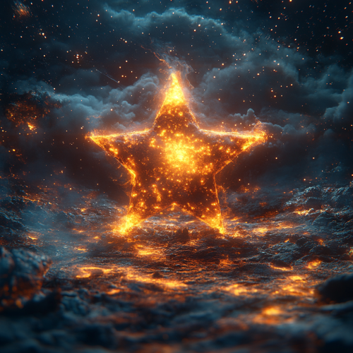 A 3D render of an anime-style illustration of a star with glowing dust. The dust is floating towards Earth. The background is a dark space with twinkling stars. The overall image has a vibrant color palette --v 6.1 --s 750 --style raw