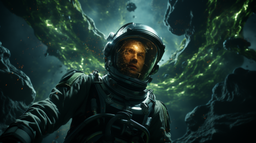 : A hyper-realistic, dramatic scene of an astronaut being pulled toward a mysterious, glowing green light in the vastness of space. The astronaut, fully suited in high-tech gear, is floating helplessly, with arms outstretched as the intense green light emanates from a swirling vortex of energy. The light bathes the entire scene in an eerie, otherworldly glow, casting sharp shadows across the astronaut's suit and reflecting off the helmet’s visor. Behind the astronaut, distant stars and nebulae create a beautiful yet ominous backdrop, their colors muted by the overwhelming presence of the green light. The light appears to distort space itself, creating ripples and bending the surrounding cosmic elements. The astronaut’s figure is caught mid-motion, as if frozen in the moment of being irresistibly drawn into this unknown force. The entire scene is filled with a sense of awe and tension, as the vastness of space and the mysterious power of the green light combine to create a visually stunning and emotional image. Shot with a cinematic wide-angle lens to capture both the astronaut and the swirling vortex of light. --ar 16:9 --v 5.2 --s 750
