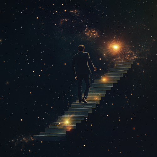 an man in a suit, climbing up steps in space in the dark, steps light up as they take steps forward, reaching for a bright star just a a few steps away.