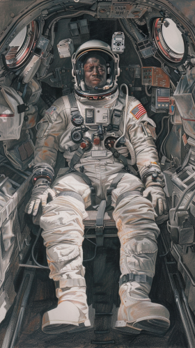 A moody color pencil art of an african american astronaut sitting in a tightly spaced white spaceship cockpit, mood of the character is crying, body of the character is faced towards the camera, --ar 9:16