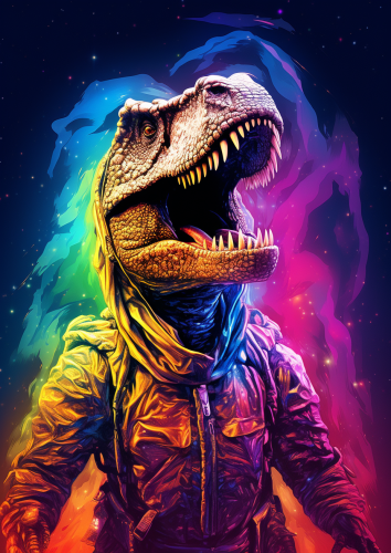 hyperreal mystical glowing prismatic iridescent glowing crystal mystical cosmic t-rex head on astronaut in nebula space rainbow neon starts HDRI full body astronaut space suit spacesuit --ar 5:7