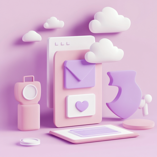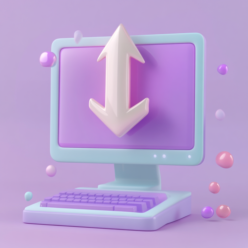 a 3d vector image of an arrow inside a computer representing a successful upload, the image should use white, purple and pink tones and would represent insurance. The feeling should be lighthearted but professional