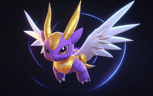 Pokémon design, 3D render style, a purple and yellow Pokémon with space-like wings flying in the air like a sci-fi drone robot that has two horns on its head, white spines around it as decoration, in a cartoon style, a gold sword on its back, a purple body color with a blue circle behind it, a full-body shot, against a black background. --ar 8:5