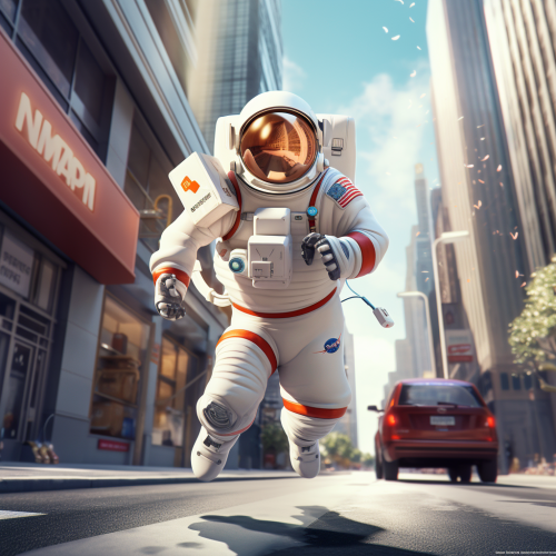 astronaut character design running in the city delivering mail, dreamworks 3d character design