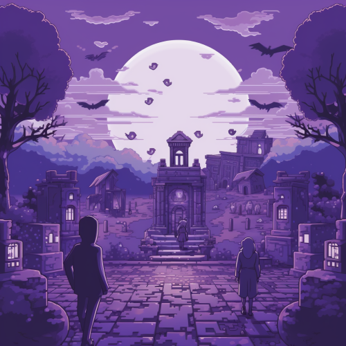 pixelated people walking through Lavender Town from Pokemon. Tombstones, purple sky, ghosts. Pixelated. Coloring page.