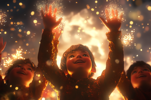 3d CGI animated close up image of children with sparkling auras, hands raised to the sky as threads of light connect them to the clouds above, very detailed, bright colors, childrens book image, cinematic lighting, --ar 3:2