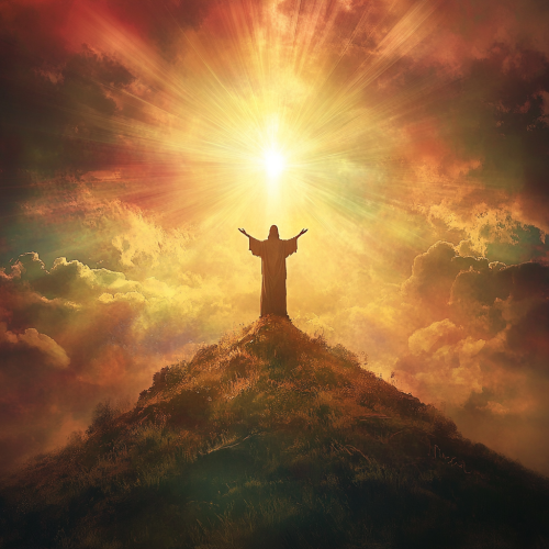 A powerful poster of Jesus standing at the top of a hill, arms raised toward the sky, with a radiant light shining down upon Him from the heavens. The background should depict a dramatic sunset, symbolizing hope, faith, and divine presence. The vibrant colors and strong contrast should evoke awe and reverence, representing the spiritual power of His message. Art Style: Cinematic, Dramatic Lighting, High Contrast