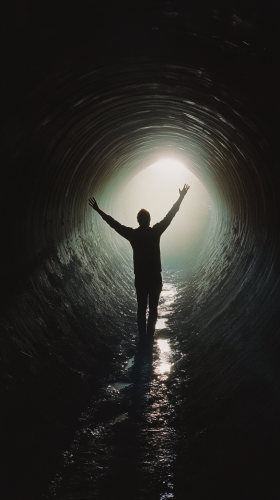 Reaching out to the light at the end of the tunnel. There is hope afterall. Warm. Shot in Kodak Vision 3 500T, ARRIFLEX 35 BL Camera, Canon K35 Prime Lenses, grainy --ar 9:16