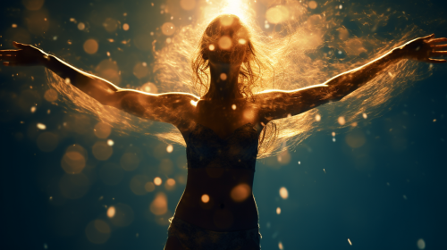Image. Double exposure. Not a very pretty woman Full body size reaching out in front Light particles --ar 16:9