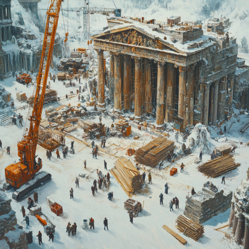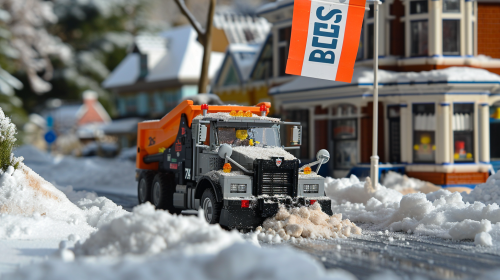 A Snow removal operation in acanadian suburb street in winter time featuring gray domp truck and Orange heavy machinery like wheel loader and grader full sized LEGO And a huge flag that says "DES BLEUS" --ar 16:9 --v 6.0