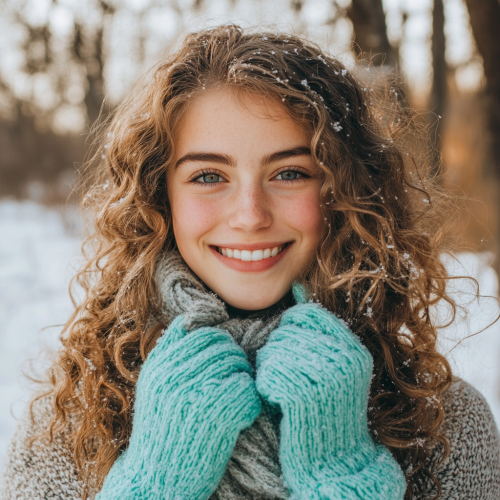 A cheerful European girl with curly hair, smiling warmly in an outdoor natural setting during the cold season. She is wearing a cozy outfit with a light turquoise scarf and mittens that add a pop of color against the frosty backdrop. Snow lightly covers the ground and trees, with soft winter sunlight casting a gentle glow on the scene. The girl's smile brings warmth to the
