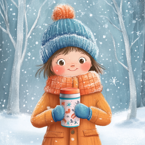 Winter scene with a young child around 6-8 years old, bundled up in a warm coat, hat, and scarf, holding a colorful insulated thermos cup in a snowy park. Soft snowflakes falling around, and snow-covered trees in the background. The child’s thermos has a playful winter-themed design with snowflakes and animals, matching the winter vibe. The child is smiling with rosy cheeks, looking excited. The mood is cozy and joyful, with soft lighting that captures the magic of winter –– photorealistic, gentle colors, winter wonderland aesthetic.