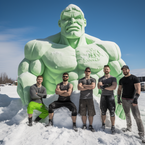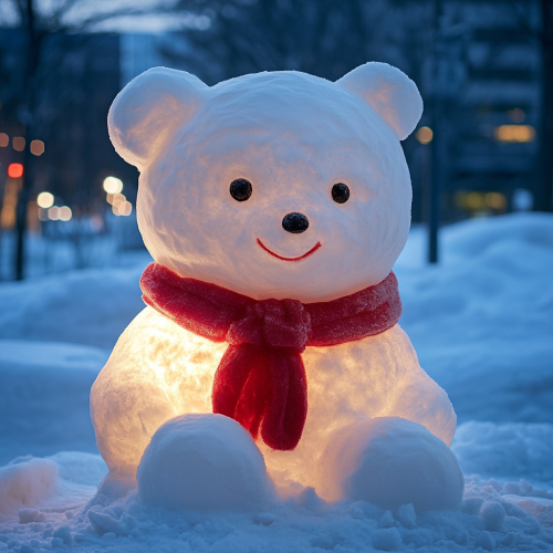 Create a snow sculpture of a character similar to 휴대리, shaped like a cute teddy bear with rounded features, wearing a red scarf around its neck. The snow bear should be crafted with soft, smooth snow, with small, round black eyes and a gentle smile. The scene should have fresh, untouched snow around the character, and the lighting should highlight the details of the snow texture, making it look warm and adorable despite the cold surroundings. Capture a cozy, playful winter vibe