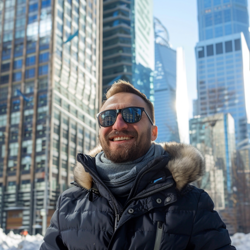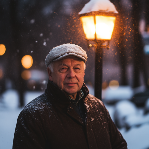 highres photo of a older business man is woolen winter coat standing in snow under a warm color street light, focus on a man face --style raw --s 50 --v 6.1