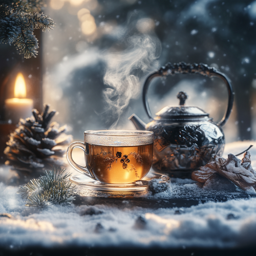 Create a high-quality, realistic horizontal photo for a calendar featuring the month of January. The scene should include a steaming cup of black tea and a teapot, surrounded by snow. Add a sprig of pine to enhance the winter atmosphere. The composition should evoke warmth and comfort amidst the cold winter setting