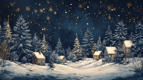textured handrawn style with pencil, winter season, small village with snow and large pine trees. include a navy blue background with gold twinkling stars. pine trees in different sizes and colors --ar 16:9