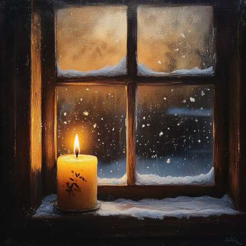 cold winter in front of a window, snow outside,associated with the Yin aspect of the Fire element, inside resonating with the candle . Warm and Loving