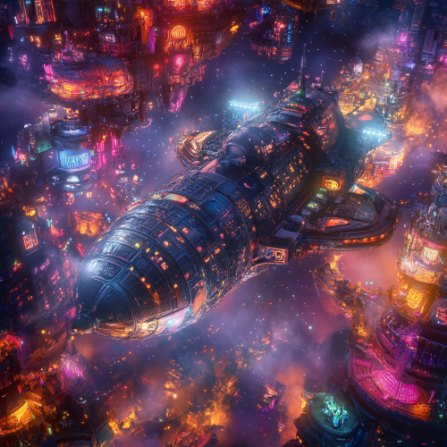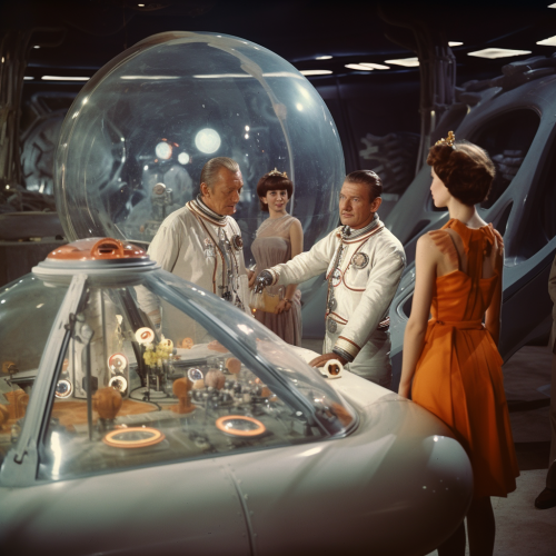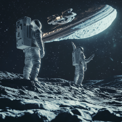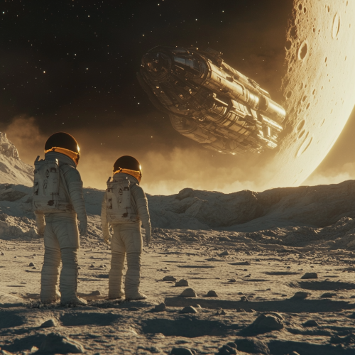 cinematic wide shot showing two astronauts on the surface of the moon, they point to the sky above them where we see an incredible spaceship flying through space, whimsical and fantastical mood, epic scale, soft light, 16:9