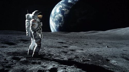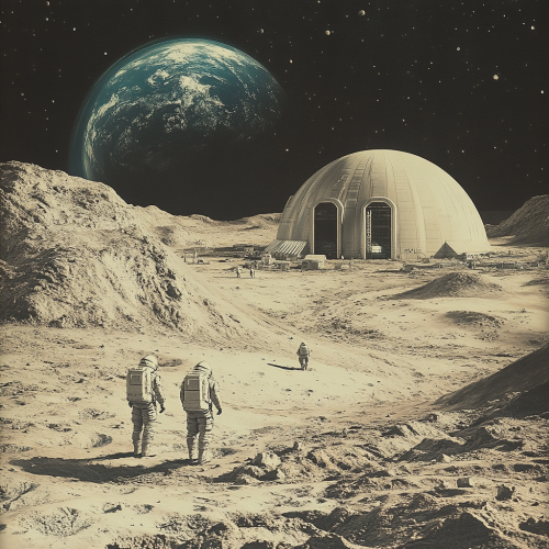 A futuristic lunar base on the surface of the moon, with astronauts exploring the barren landscape, domed habitats, and Earth visible in the distance, 1:1 --v 6.1
